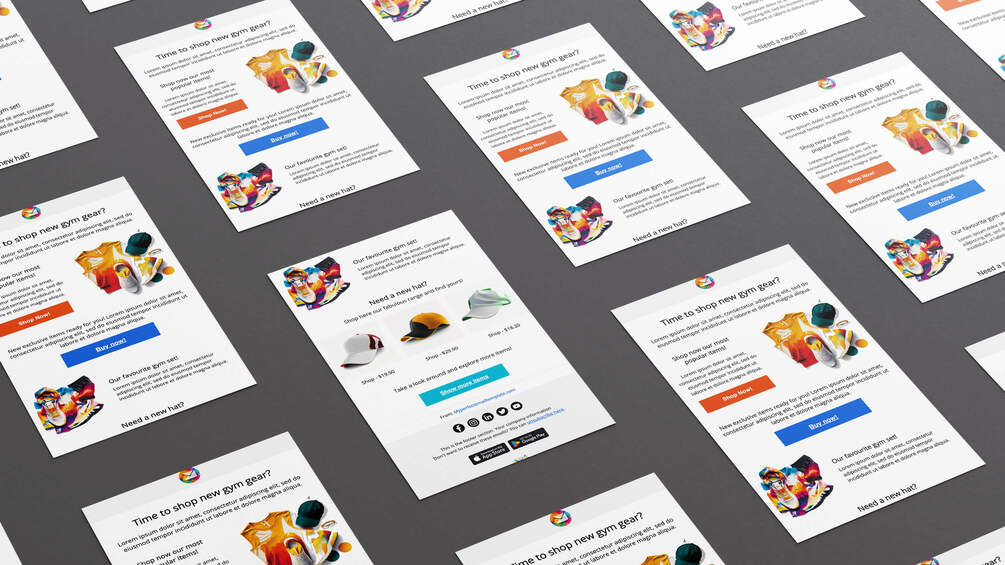 - E-commerce Email template layout divided into: Header, feature/hero banner, body copy, Call to action, column layout staked in mobile (2+3 columns), footer with social icons and inclusive of all important information.
